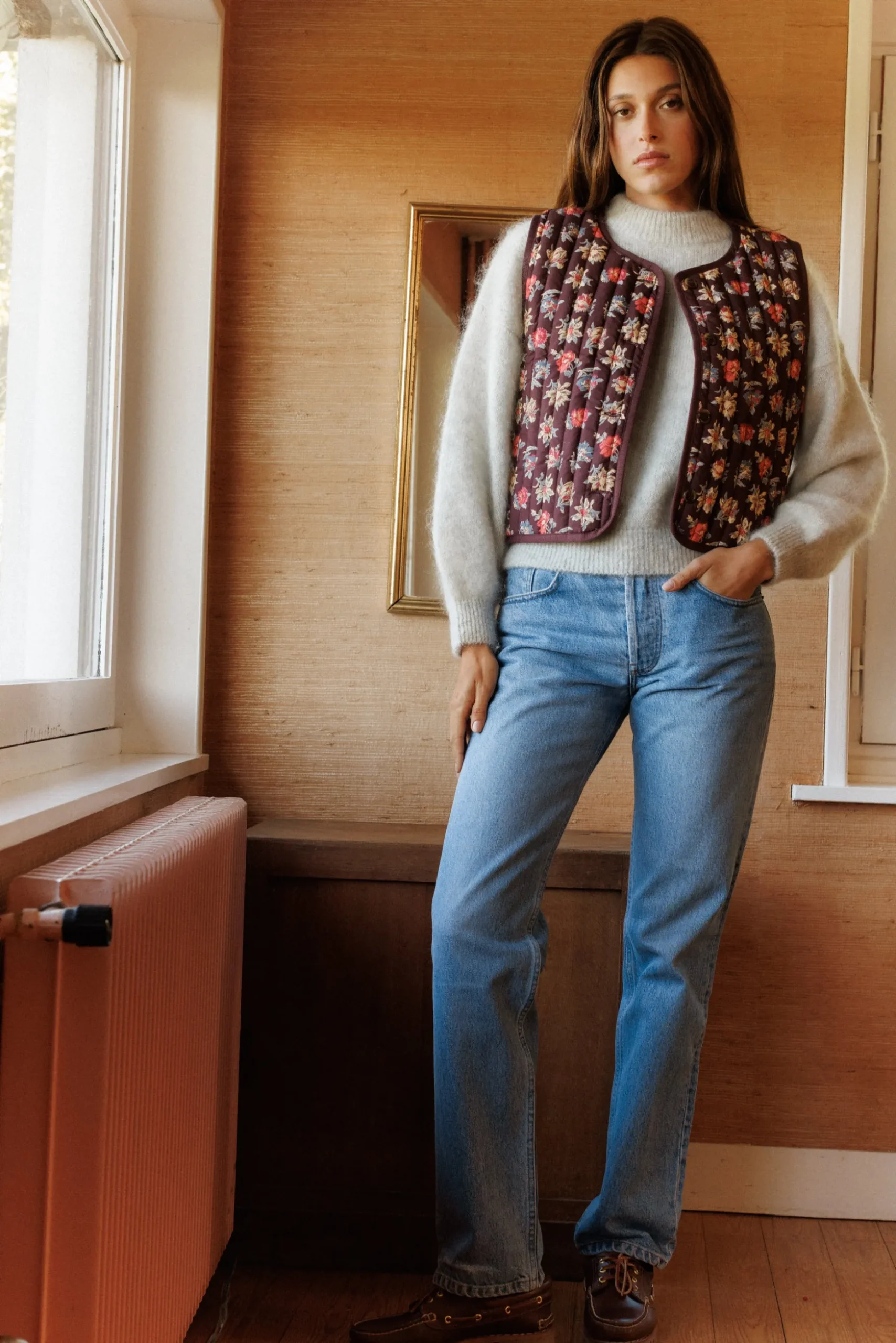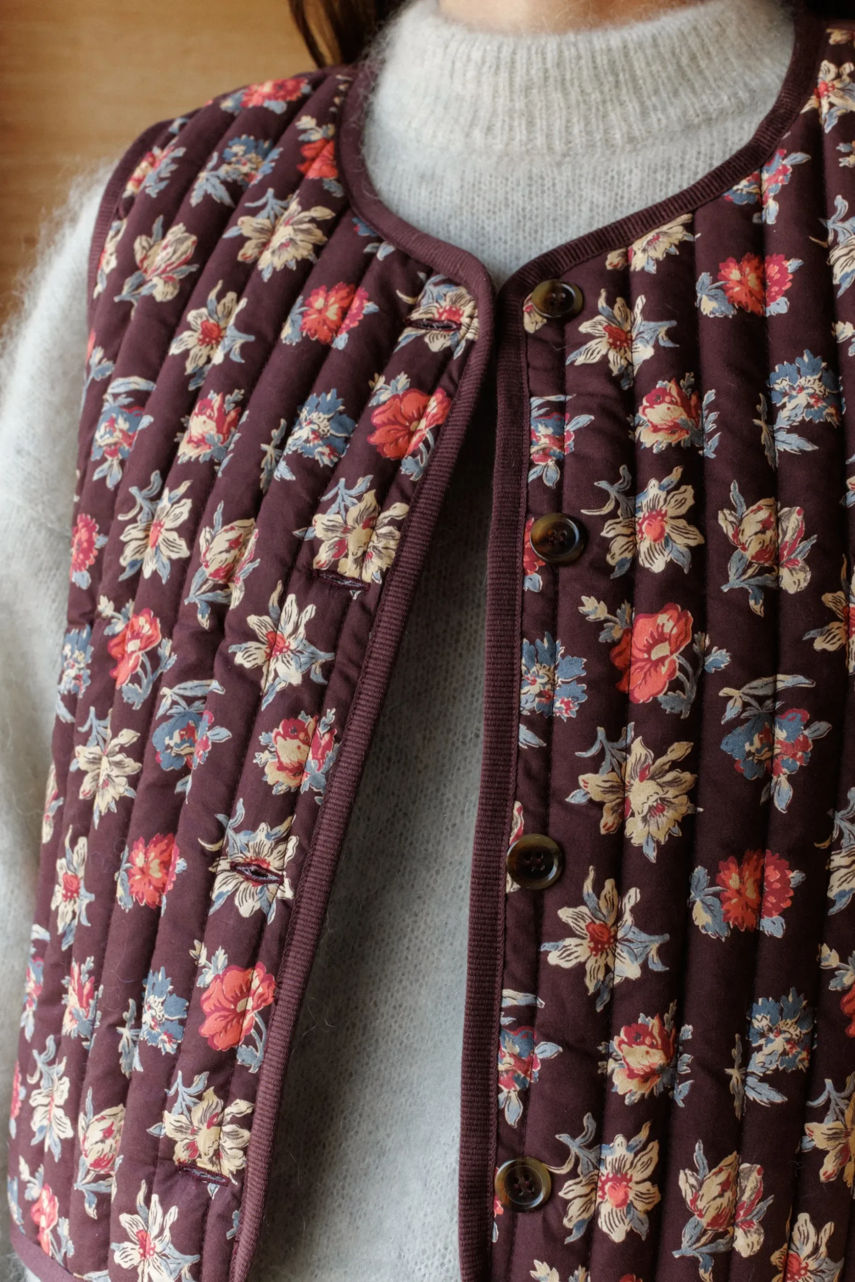 Un motif qui s’efface, une forme qui rassure, ce gilet suit le vent, comme un Souffle au loin.