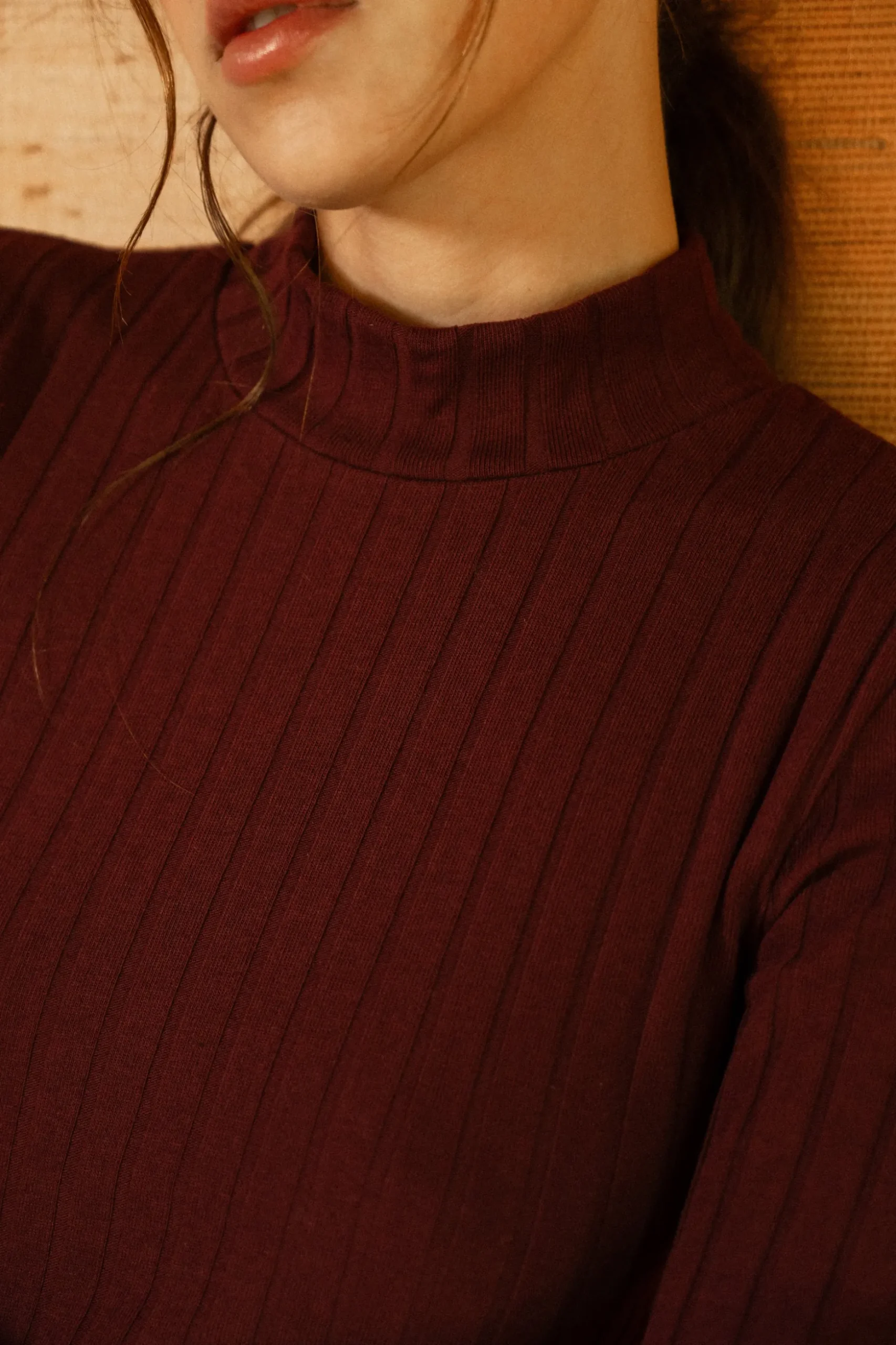 Une matière réconfortante qui glisse sur nos courbes, un col cheminée, pour notre robe grenat Nuit de hasard, nous n’avons justement rien laissé au hasard.