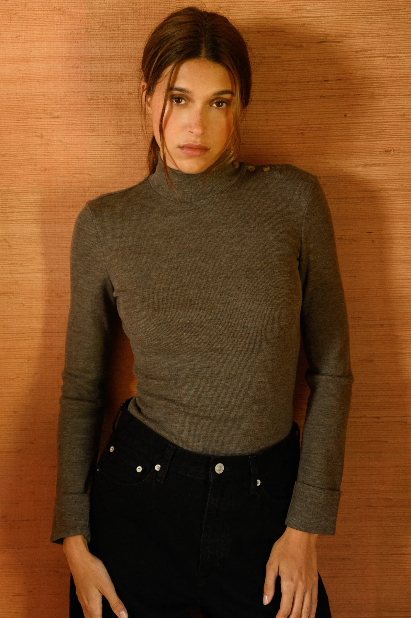 - un jersey côtelé en laine dans un coloris chiné qui apporte chaleur durant les journées d’hiver.
