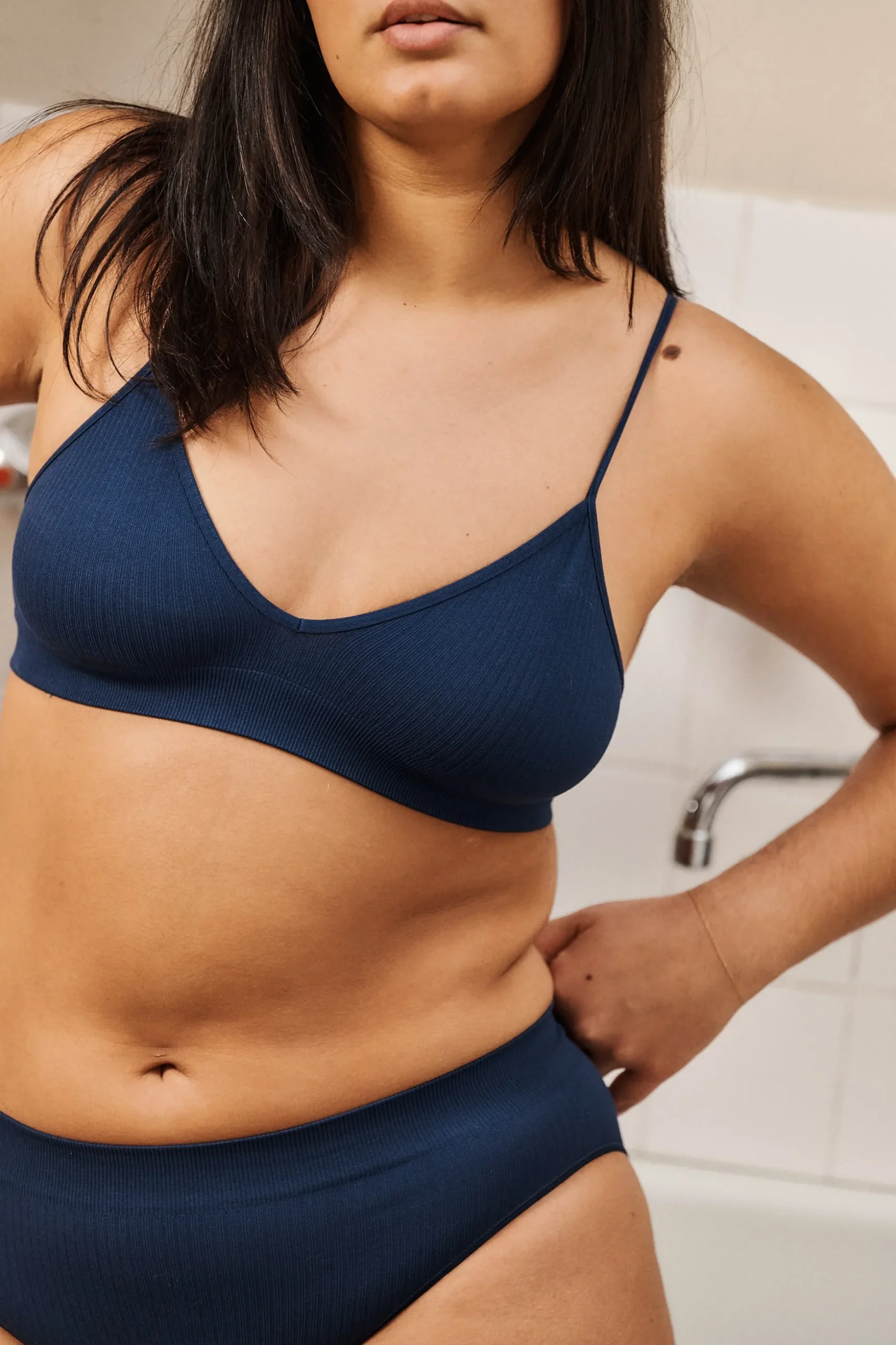 Une lingerie sereine, à fleur de peau, pour se sentir bien. C’est notre nouveau triangle bleu marine sans couture.