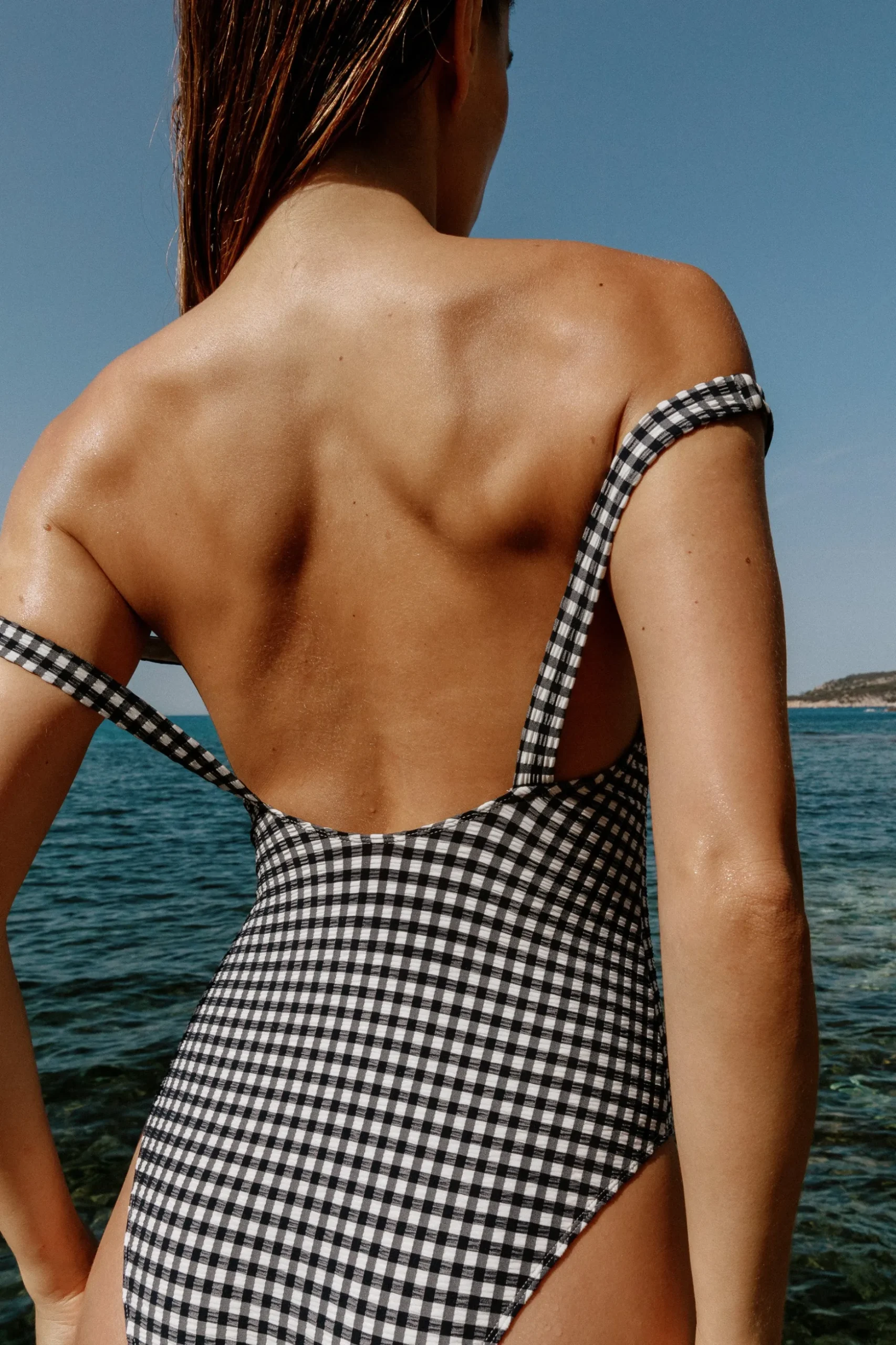 Notre maillot de bain une-pièce à carreaux Cabine secrète a comme un goût de volver. De volver al mar. De retrouvailles avec le sable fin de la côte (d’azur).