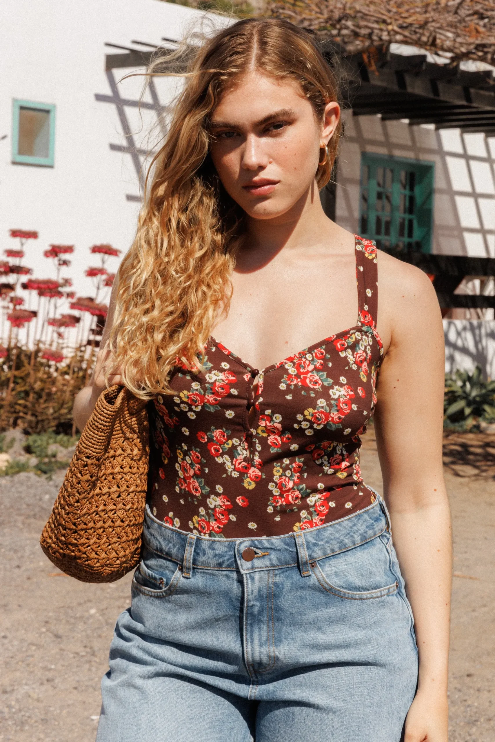 - Un imprimé vintage où un brun lumineux rencontre des fleurs délicates