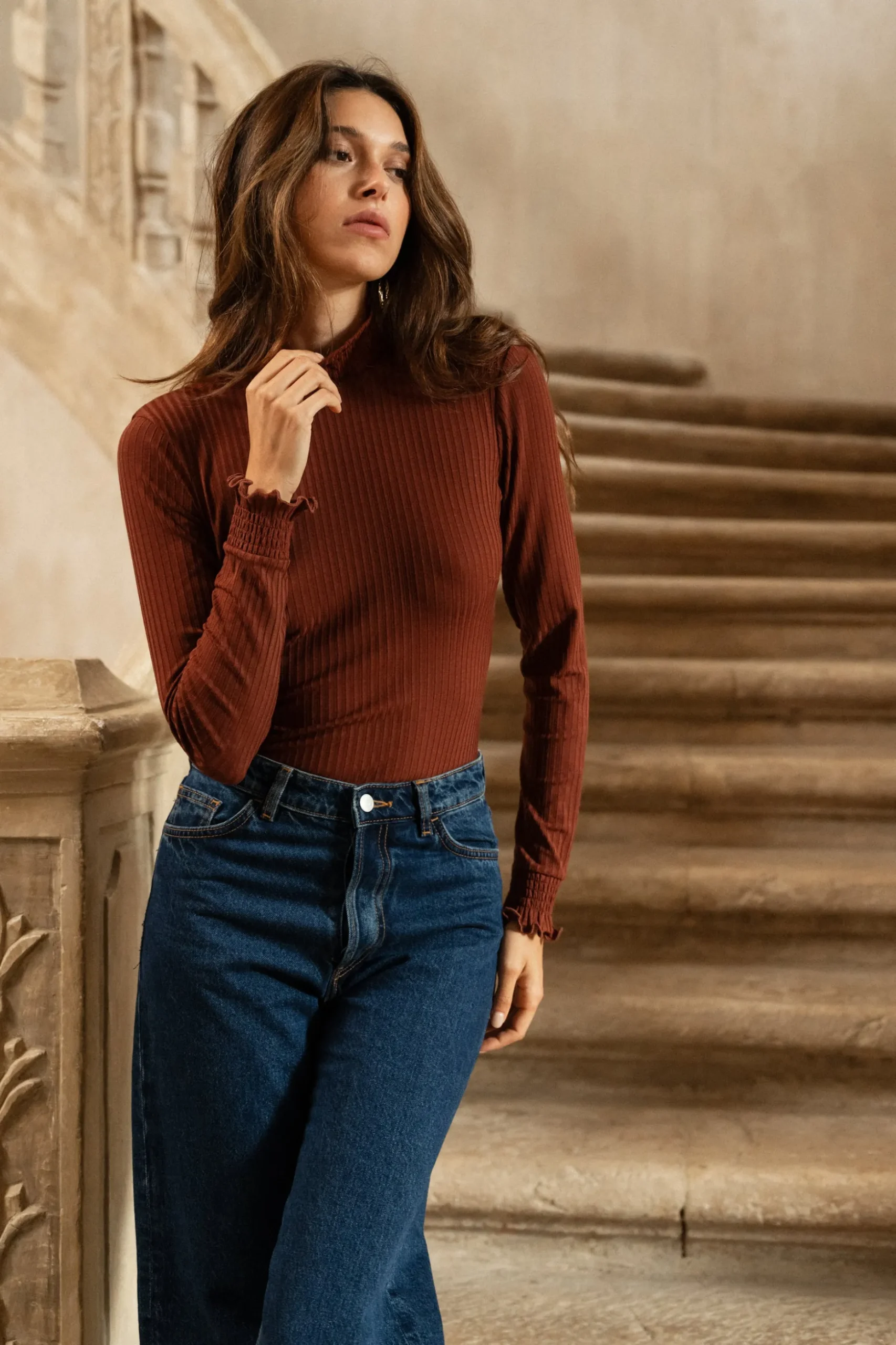 - Un col montant smocké avec une finition volantée