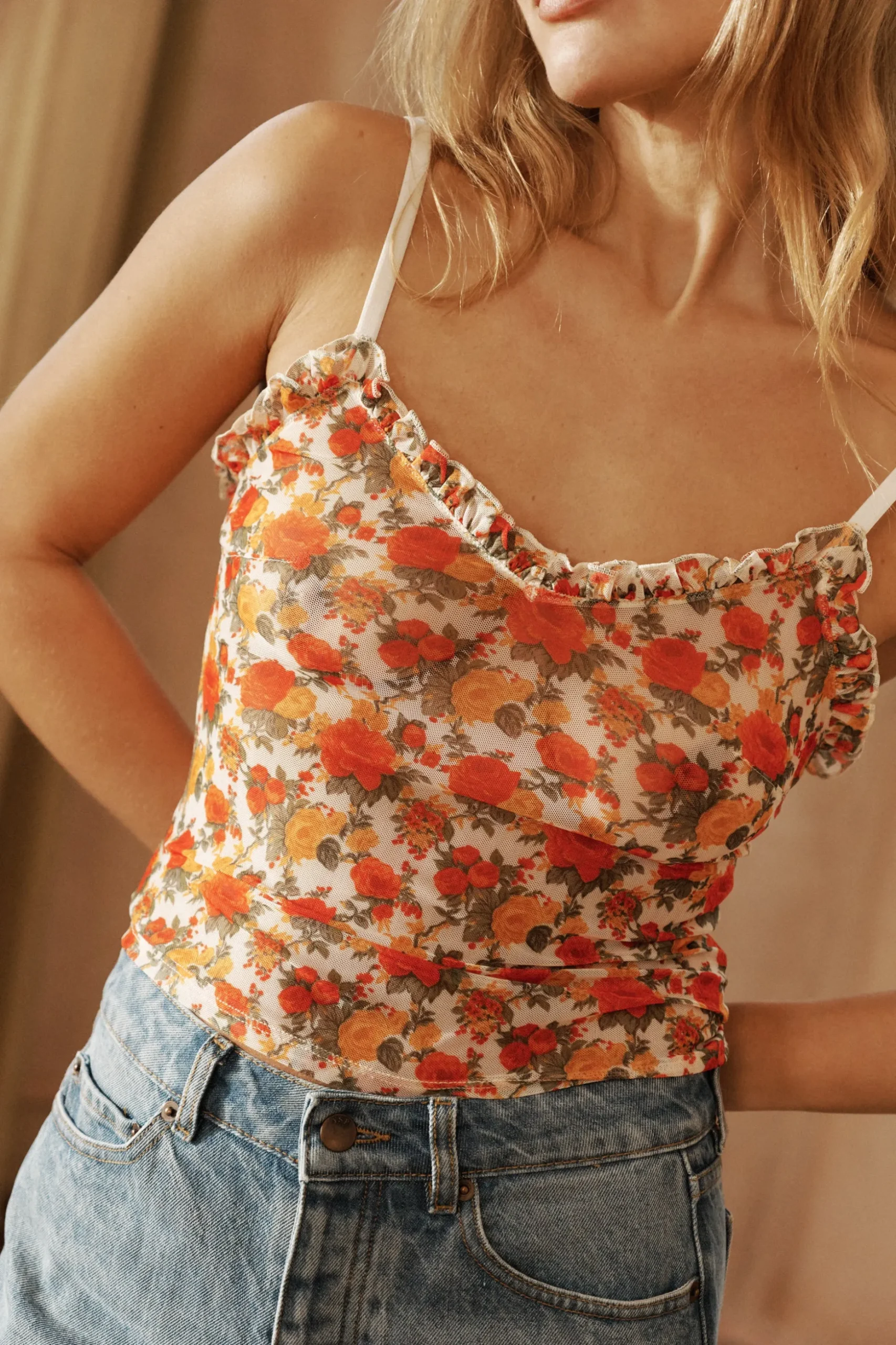 - Ses petits volants viennent souligner tout le décolleté et les emmanchures