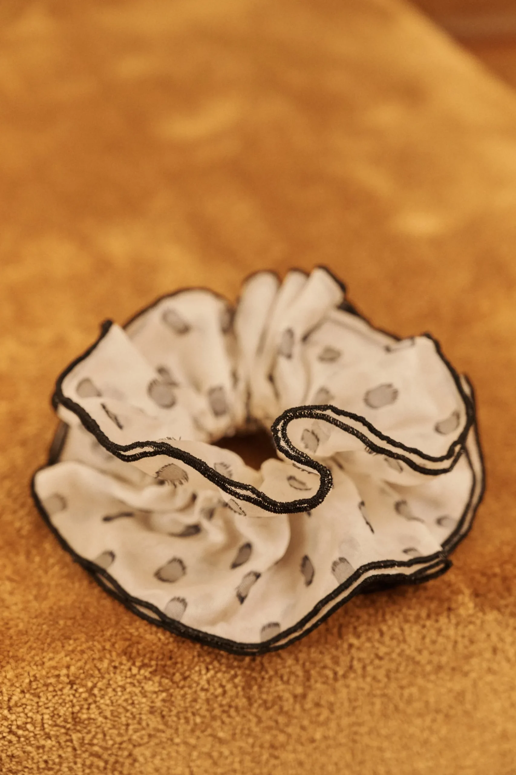 Chouchou volumineux en soie réalisé à partir de stocks dormants. Son imprimé à pois, imaginé et développé par nos stylistes se marie à merveille avec des lèvres rouges audacieuses.