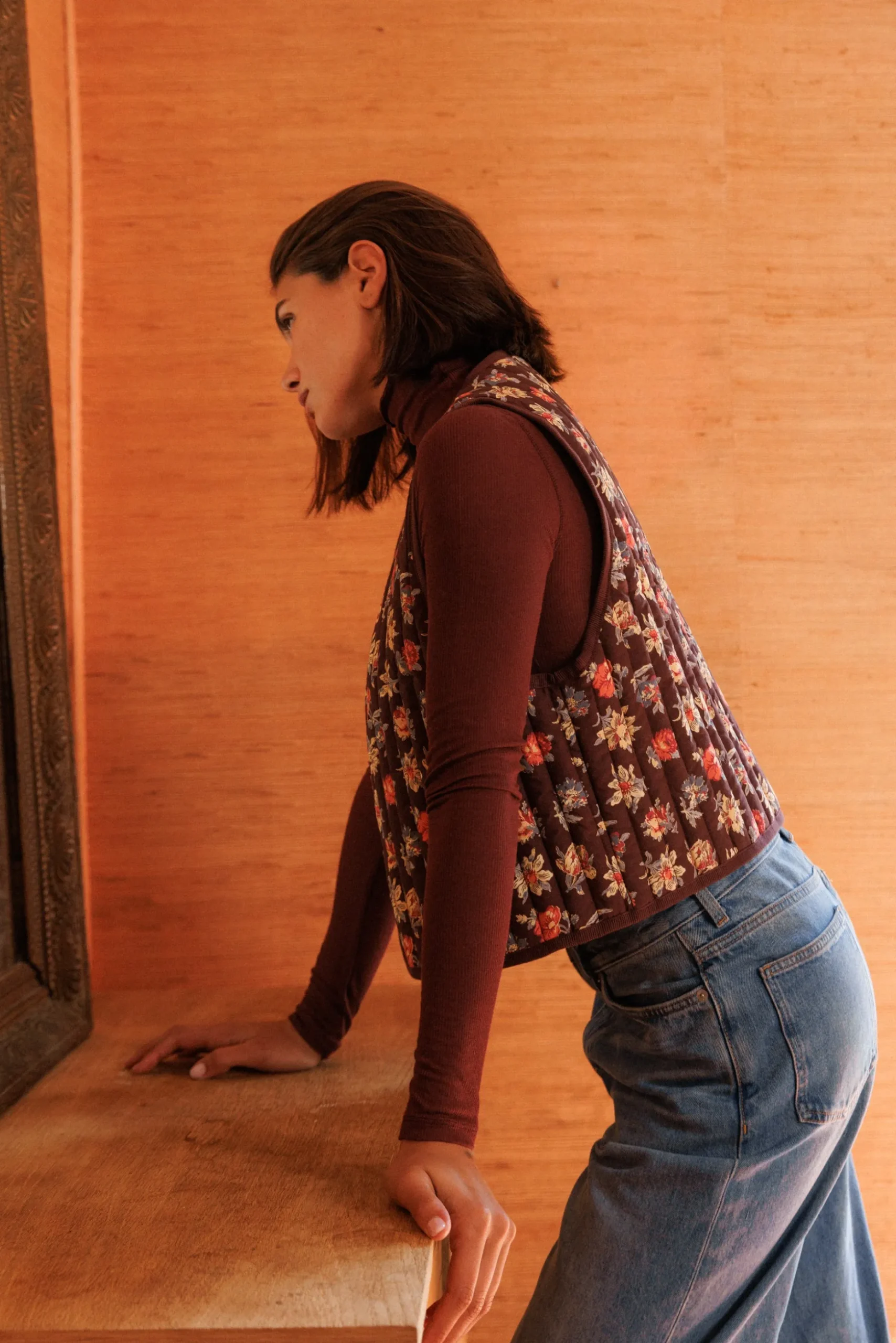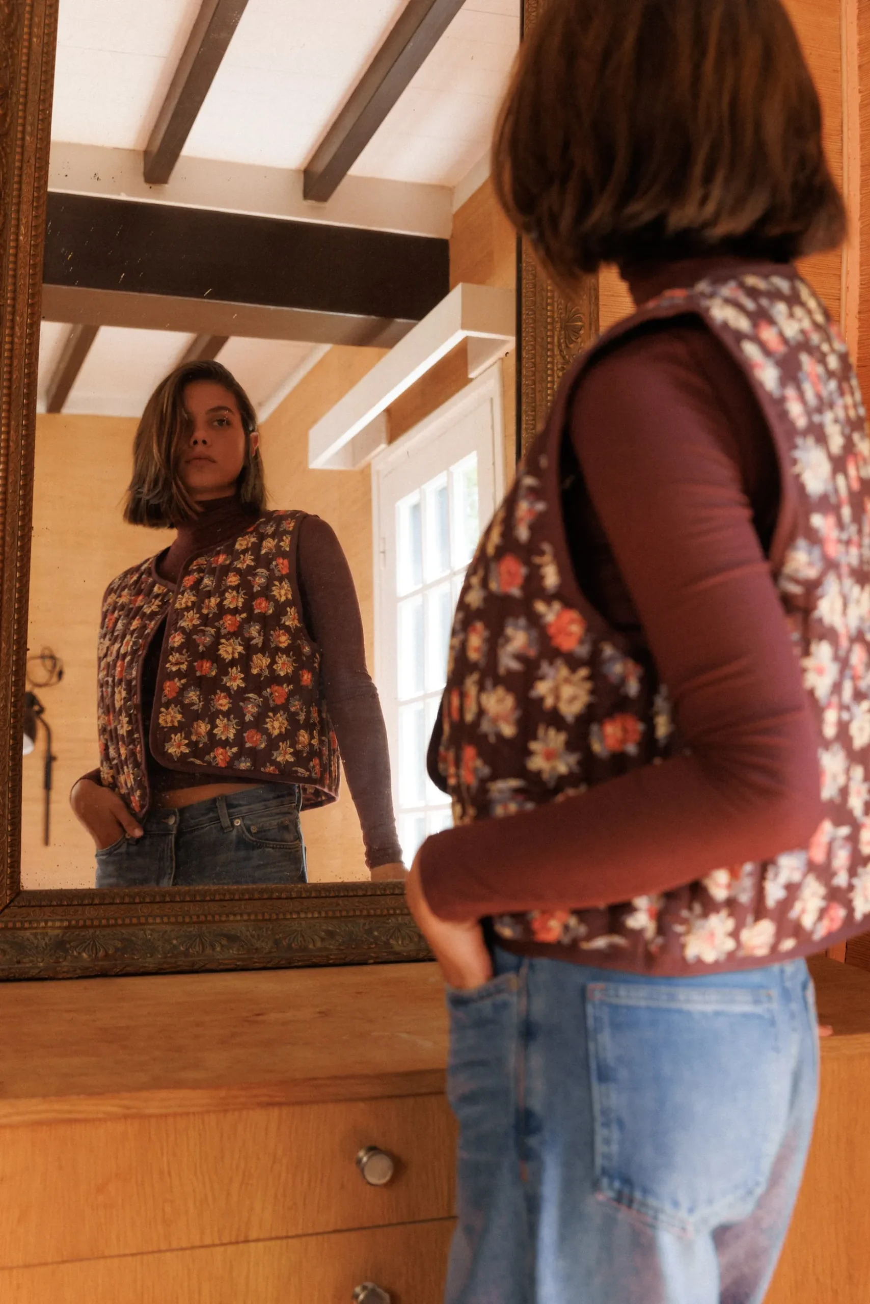 Un motif qui s’efface, une forme qui rassure, ce gilet suit le vent, comme un Souffle au loin.