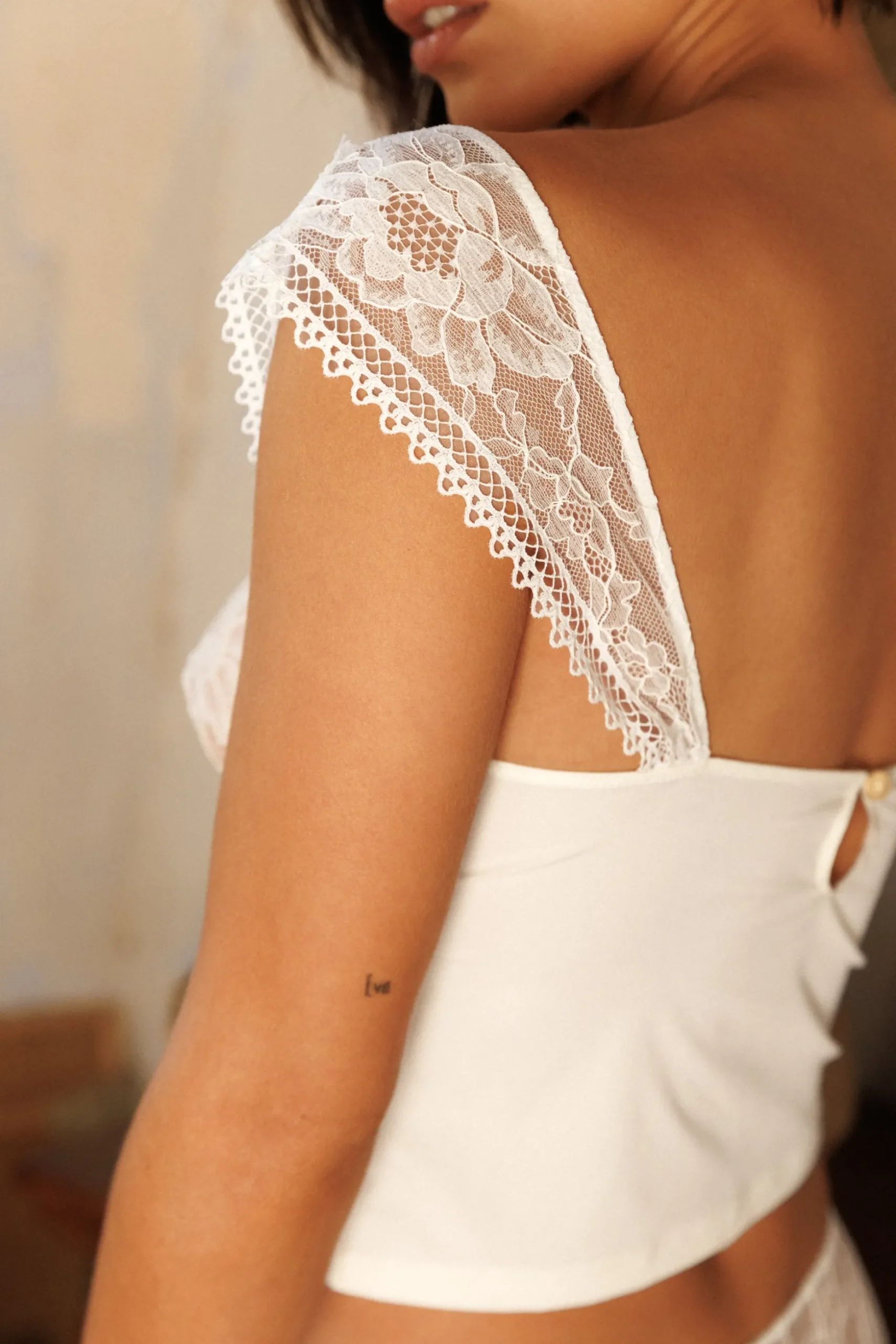 - Une forme de top court, tout en dentelle qui se porte près du corps