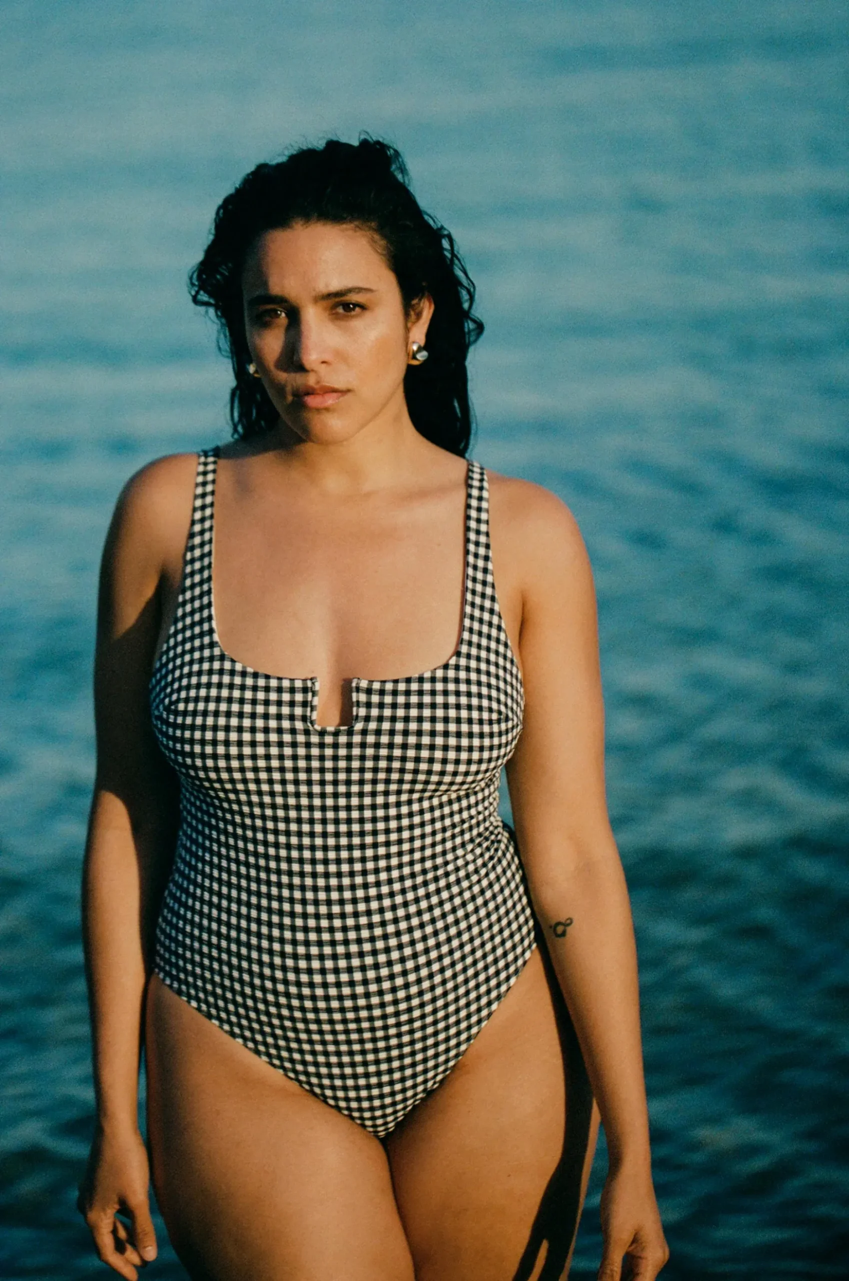 Notre maillot de bain une-pièce à carreaux Cabine secrète a comme un goût de volver. De volver al mar. De retrouvailles avec le sable fin de la côte (d’azur).